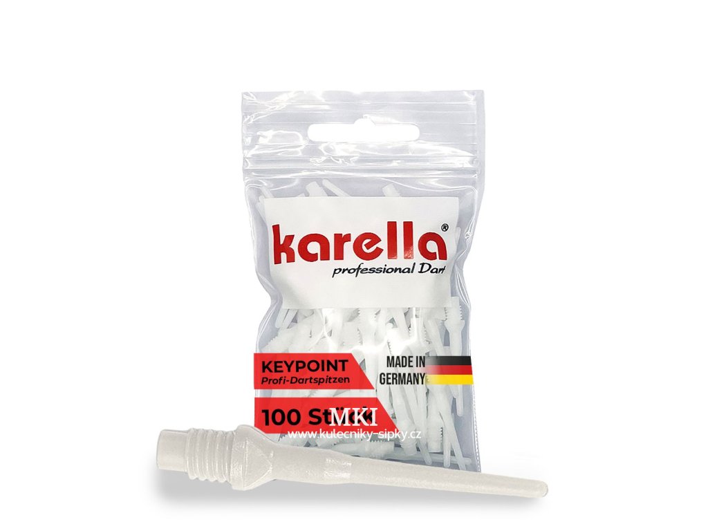Tento hrot na šipky Karella, vyvinutý v Německu, patří mezi nejprodávanější měkké šipky. Jeho jedinečnou vlastností je perfektní rovnováha mezi pružností a zachováním tvaru, která zabraňuje ohýbání šipky v desce. Mírně zúžená přední část 25mm hrotu zajišťuje bezpečné uchycení v desce a snadné vyjmutí šipky. Výztuha v zadní části hrotu poskytuje vysokou stabilitu a odolnost. Hroty Karella Keypoint jsou opatřeny anglickým závitem 2BA (4,7 mm) a jsou proto perfektně vhodné pro všechny standardní měkké šipky. Tento hrot na šipky je ideální pro turnajové hráče i amatérské hráče a je kompatibilní se všemi typy elektronických terčů a strojů na měkké šipky. Špičková kvalita „Vyrobeno v Německu“.